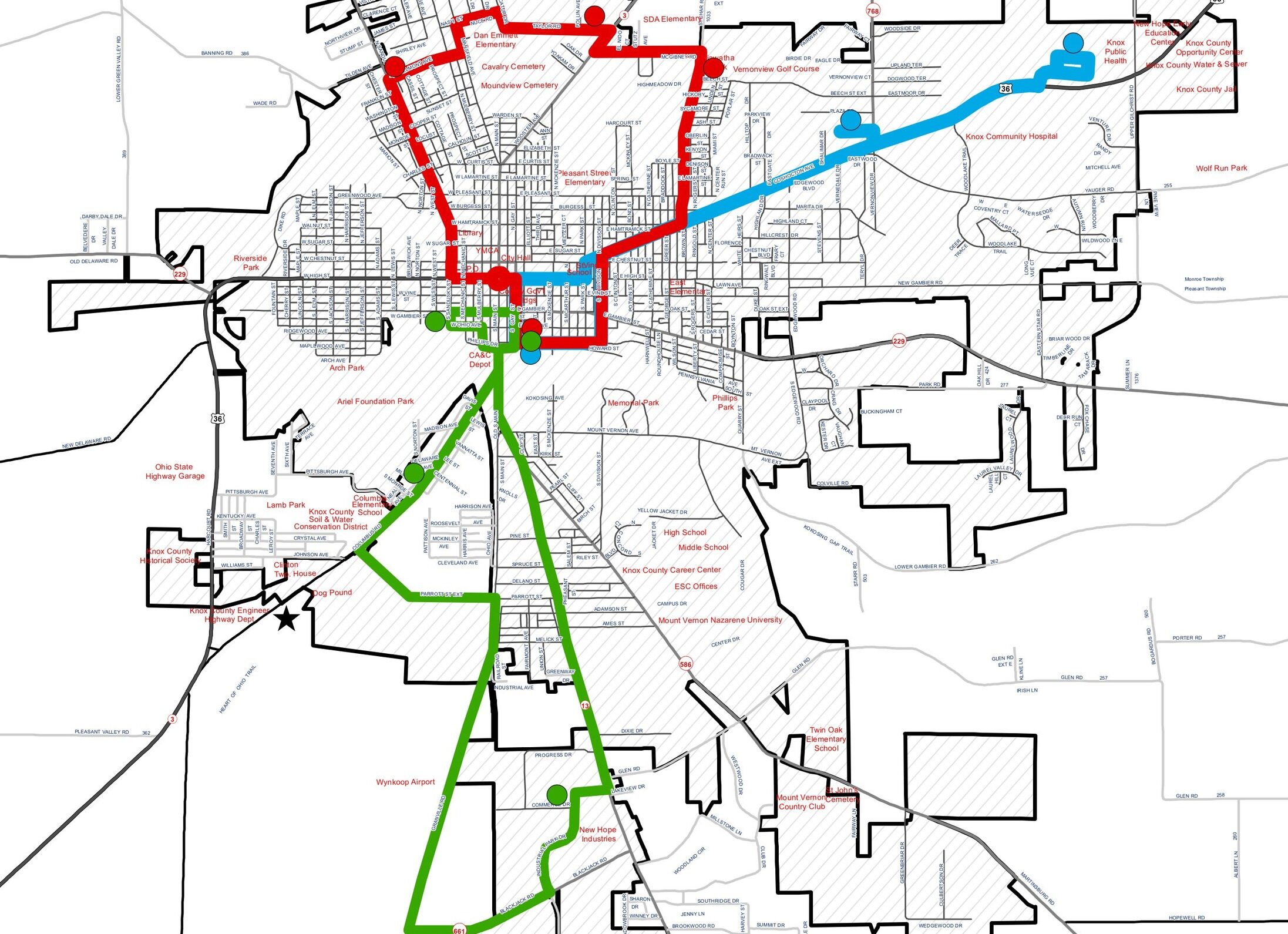 The Kenyon Route can deviate ¾ mile beyond the stated routes when requested. Call (740) 392-7433 to request a deviation between the route stops.