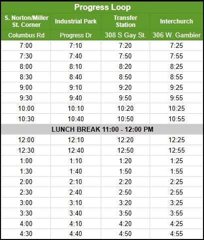 No service running 11:00 A.M.– Noon (Lunch Break)